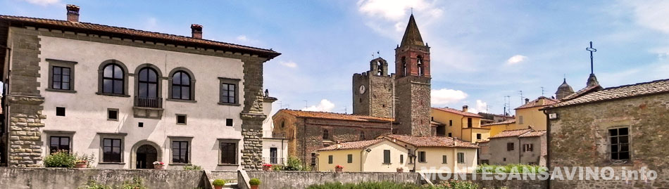 Palazzo del Monte è in pietra serena a bugnato nel piano terreno e di ordine ionico al primo piano con finestre a frontone triangolare e ricurvo. Il cortile interno con loggiato a tre archi ha due caratteristici pozzi. La parte tergale, che si affaccia su un grazioso giardino pensile, è più tarda: fatta costruire da Giovanni Maria Di Monte nipote di Antonio, è opera di Nanni di Baccio Bigio. All'interno del palazzo, un tempo superbamente arredato, si trovano una preziosa porta del '500 intagliata da Fra' Giovanni da Verona nell'attuale Sala Consiliare (quest'ultima è dipinta con affreschi degli stemmi delle più note famiglie savinesi) e, lungo i corridoi del piano superiore, una piccola galleria di ritratti di personaggi illustri di Monte San Savino e di membri delle famiglie regnanti di Toscana. Di fronte al Palazzo del Monte si trova l'elegante